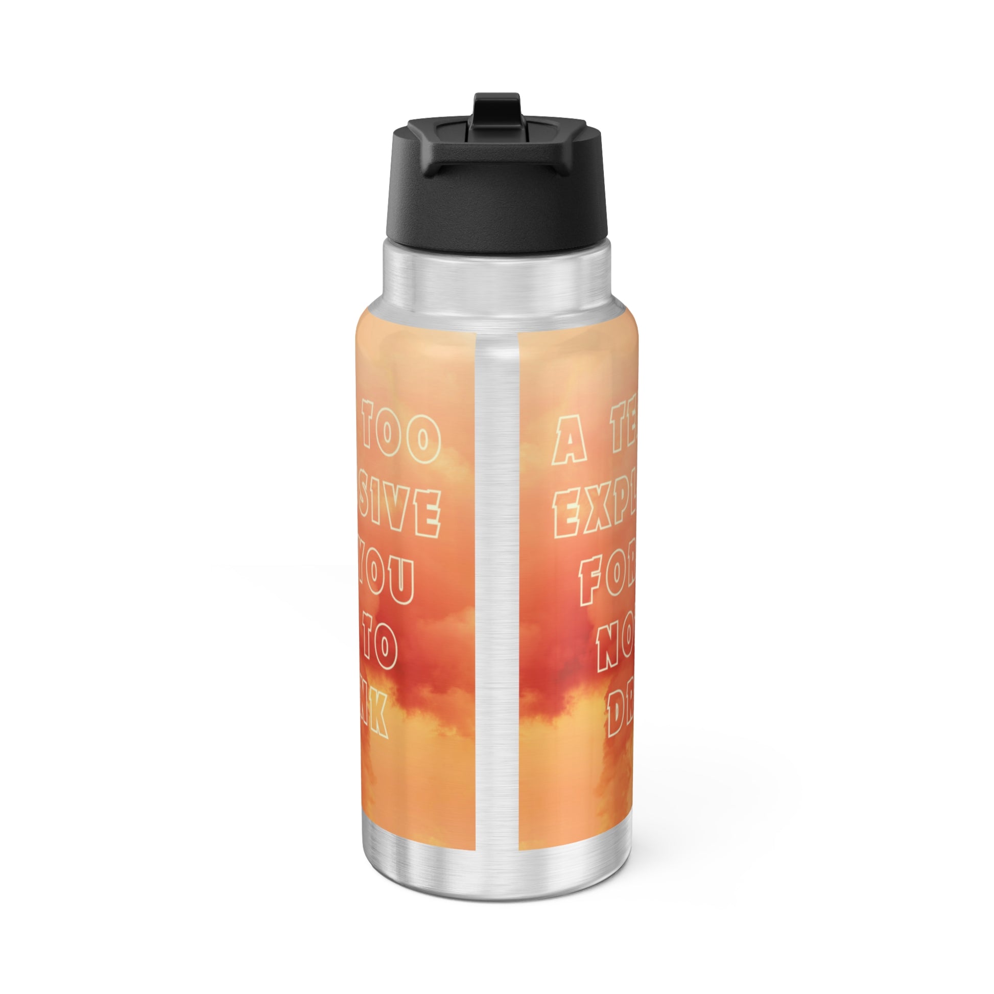 - Materials: stainless steel bottle, black plastic screw-on cap